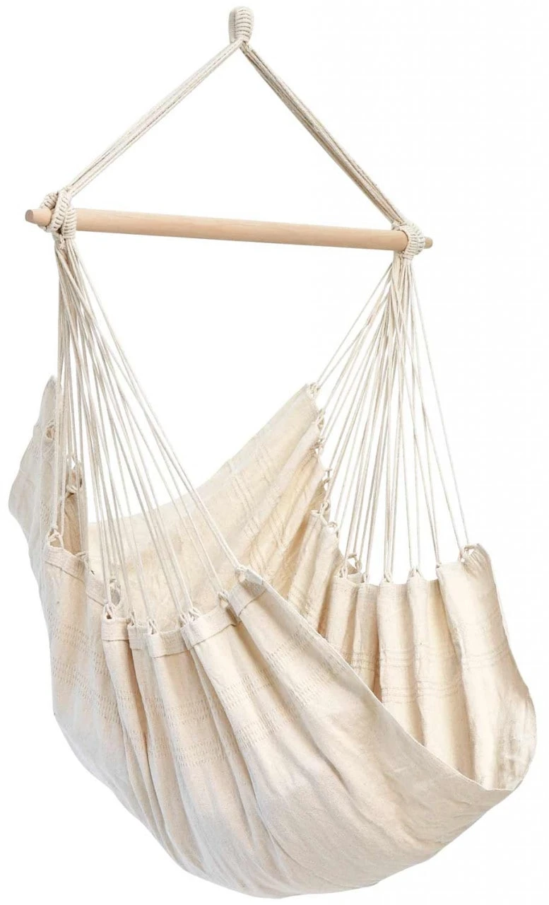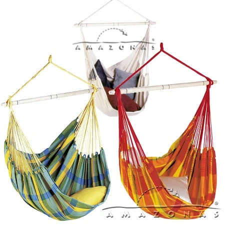 Mit dem Brasil Hängestuhl von Amazonas kannst du relaxt schaukeln. Bequemre Hängesessel aus festem Baumwollgewebe. Aufhängevorrichtung mit Eschenholz-Stab. Belastbarkeit: 120 kg.