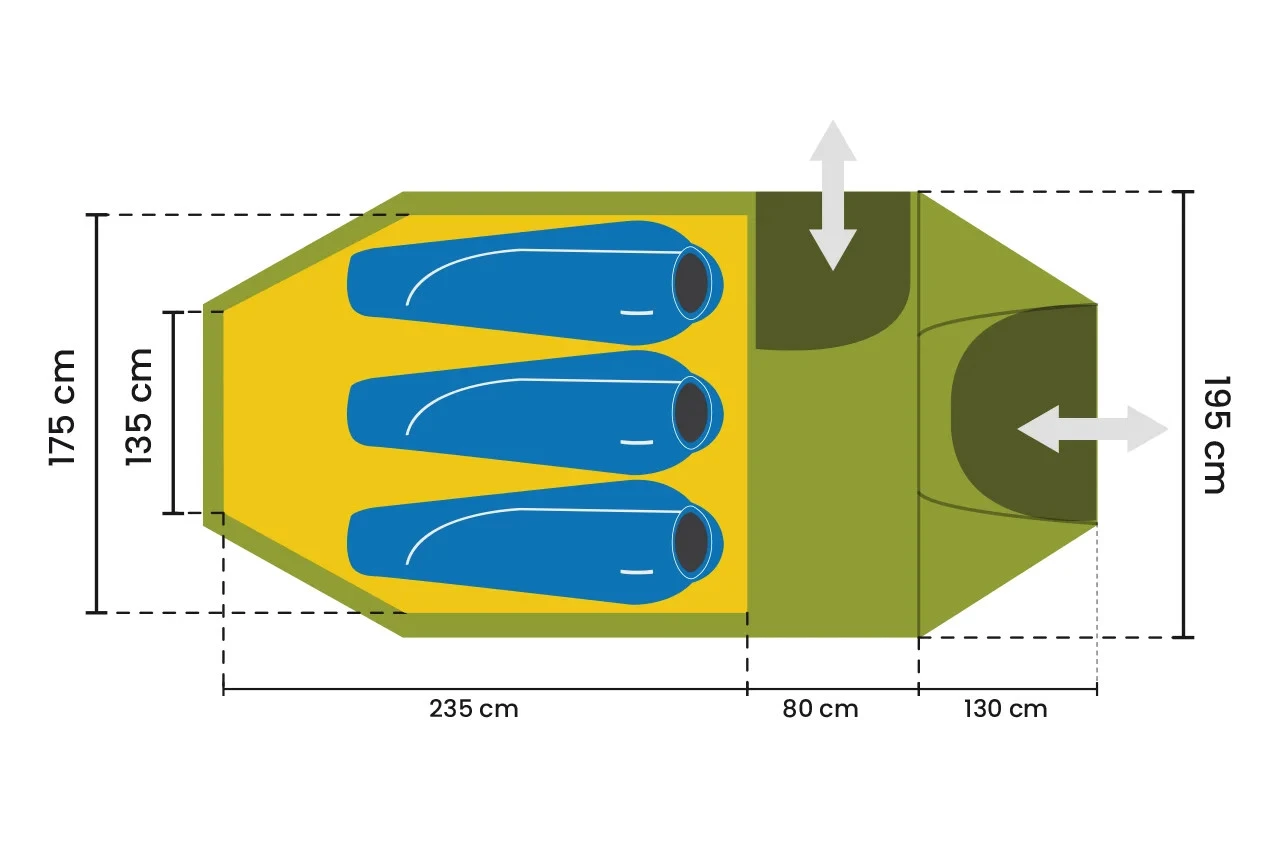 Außenzelt: 100 % Polyester Ripstop, 75D Ripstop, beidseitig PU-beschichtet, 3.000 mm WS