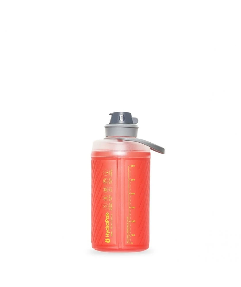 Die flexiblen Flaschen werden modernisiert. Die überarbeitete Flux Flasche hat die Form einer kompakten starren Flasche. Sie lässt sich wie eine weiche Trinkflasche zusammendrücken und reduziert das Gewicht der leeren Flasche um 50 %. Sie ist mit einem staubdichten Deckel und einem drehbaren Mundstück für schnelles Trinken ausgestattet. Die Flux steht wie eine starre Flasche aufrecht, kann aber nach dem Trinken platzsparend verstaut werden.