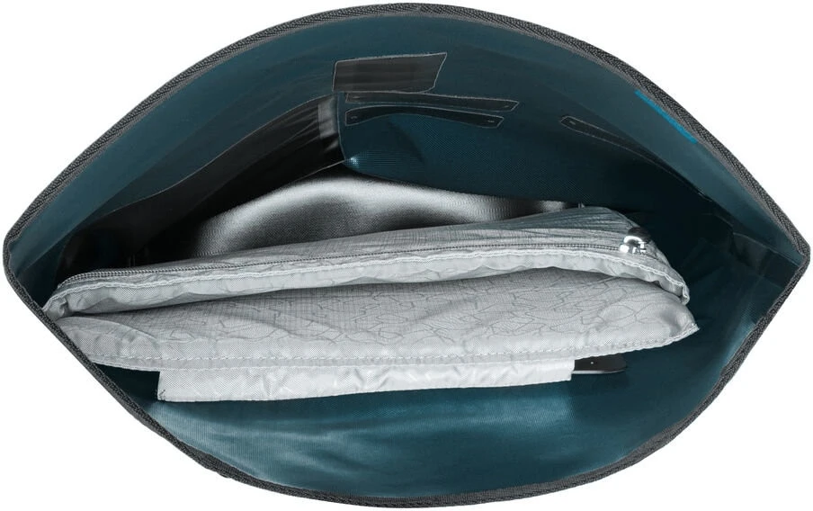 Das robuste, bewährte Material und der Rollverschluss verpacken deine wichtigsten Dinge wasserdicht, den Laptop übrigens auch gepolstert. Außen gibt noch eine kleine Tasche für den schnellen Zugriff – diese allerdings nicht wasserdicht.