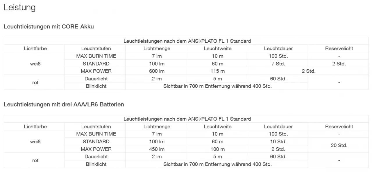 - drei Weißlicht-Stufen: MAX BURN TIME (maximale Leuchtdauer), STANDARD (optimales Verhältnis Leuchtkraft/Leuchtdauer) und MAX POWER (maximale Leuchtkraft),