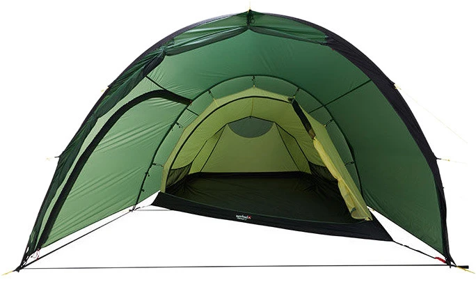Das Zelt hat eine aerodynamisch günstige Form und ist dadurch sehr sturmstabil. Durch den asymetrischen Schnitt des Innenzeltes am Eingang ensteht eine sehr lange Liegfläche auf einer Seite, geeignet für Körpergrößen über zwei Meter.