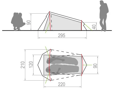 Maße Innenzelt (LxBxH) 220 x B 120/90 X H 90 cm